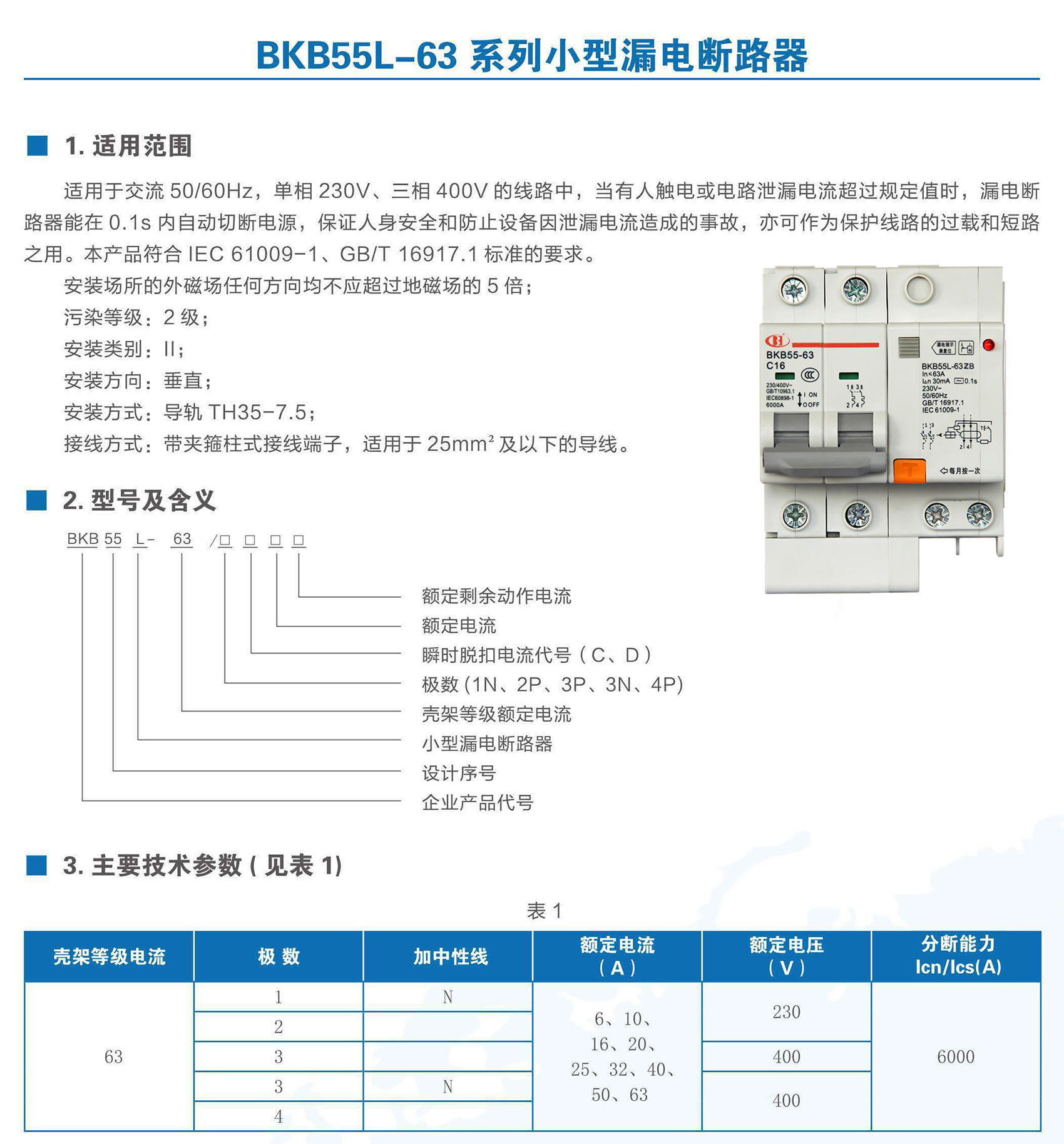 BKB55L-63ZB系列自诊断小型漏电断路器适用于交流50/60Hz,额定电压至230V,额定电流至63A的线路中,作为人身触电和设备漏电保护之用;剩余电流动作功能自诊断、失效报警,当产品漏电保护功能出现异常时会通过报警模块提醒用户;并可用于线路和电气设备的过载及短路保护。本产品符合GB/T 16917.1、IEC 61009-1标准。