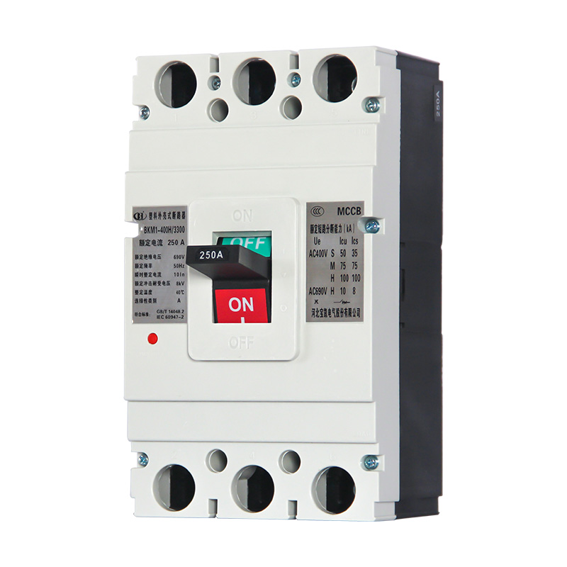 BKM1系列塑料外壳式断路器适用于交流50Hz,额定绝缘电压690V,额定工作电压至400V,额定电流至800A的配电网络中,用来分配电能和保护线路免受过载、短路、欠电压等故障的损坏。额定电流630A及以下断路器亦可作电动机不频繁起动用。本系列断路器具有隔离功能。本系列断路器可垂直安装(即竖装),亦可水平安装(即横装)。本系列断路器执行标准:IEC 60947-1及GB/T 14048.1 《低压开关设备和控制设备 第1部分:总则》IEC 60947-2及GB/T 14048.2 《低压开关设备和控制设备 第2部分:断路器》IEC 60947-4及GB/T 14048.4 《低压开关设备和控制设备 第4-1部分:接触器和电动机起动器 机电式接触器和电动机起动器(含电动机保护器)》